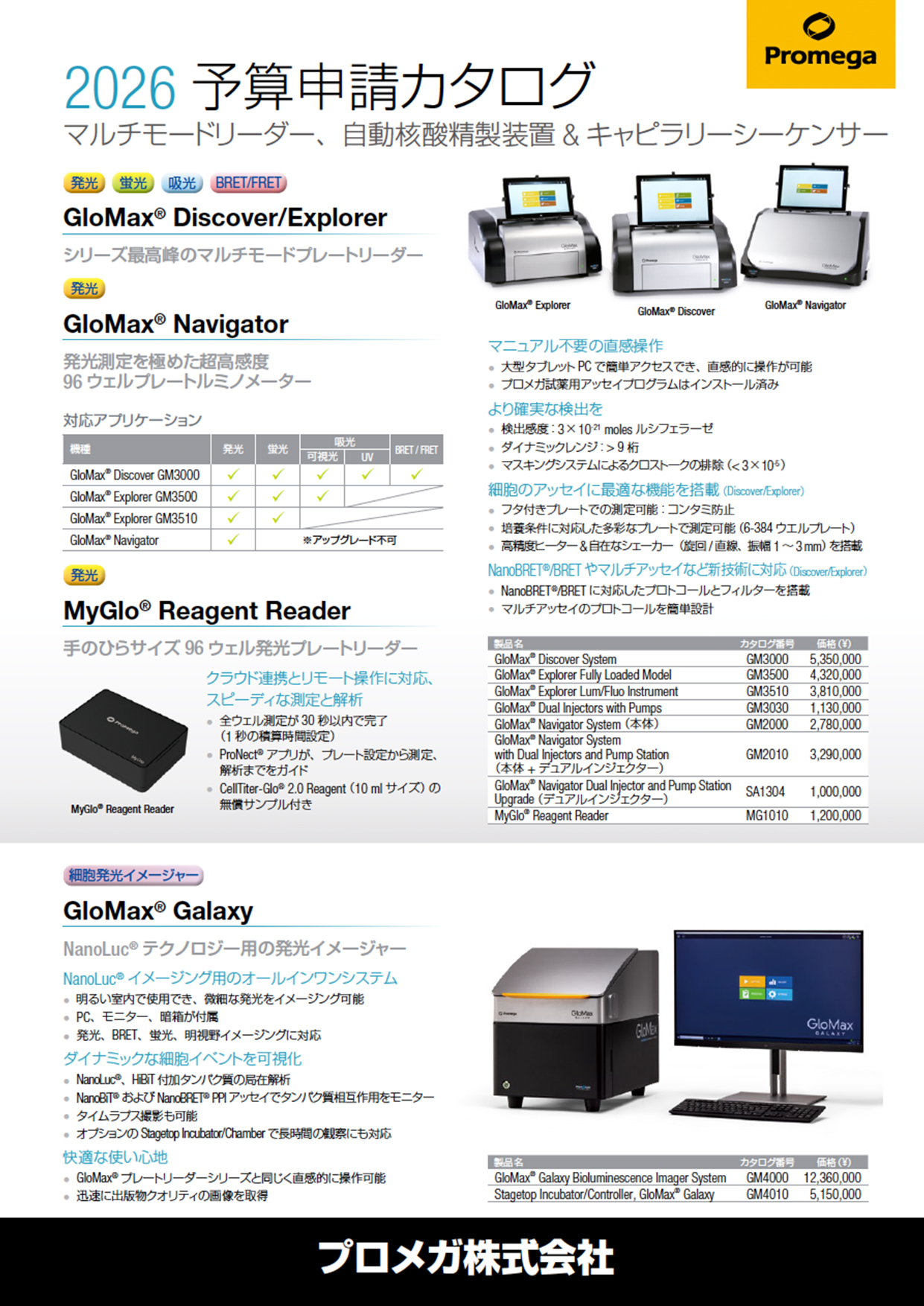 2026予算申請カタログ マルチモードリーダー、自動核酸精製装置 & キャピラリーシーケンサー NanoLuc® イメージング用のオールインワンシステム • 明るい室内で使用でき、微細な発光をイメージング可能 • PC、モニター、暗箱が付属 • 発光、BRET、蛍光、明視野イメージングに対応 ダイナミックな細胞イベントを可視化 • NanoLuc®、HiBiT 付加タンパク質の局在解析 • NanoBiT® およびNanoBRET® PPI アッセイでタンパク質相互作用をモニター • タイムラプス撮影も可能 • オプションのStagetop Incubator/Chamber で長時間の観察にも対応 快適な使い心地 • GloMax® プレートリーダーシリーズと同じく直感的に操作可能 • 迅速に出版物クオリティの画像を取得 GloMax® Galaxy 細胞発光イメージャー NanoLuc® テクノロジー用の発光イメージャー 製品名カタログ番号価格(¥) GloMax® Galaxy Bioluminescence Imager System GM4000 12,360,000 Stagetop Incubator/Controller, GloMax® Galaxy GM4010 5,150,000 GloMax® Discover/Explorer 発光 蛍光 吸光 BRET/FRET シリーズ最高峰のマルチモードプレートリーダー GloMax® Navigator 発光 発光測定を極めた超高感度 96 ウェルプレートルミノメーター MyGlo® Reagent Reader 発光 手のひらサイズ 96 ウェル発光プレートリーダー 対応アプリケーション 機種発光蛍光 吸光 可視光 BRET / FRET UV GloMax® Discover GM3000 ü ü ü ü ü GloMax® Explorer GM3500 ü ü ü GloMax® Explorer GM3510 ü ü GloMax® Navigator ü ※アップグレード不可 マニュアル不要の直感操作 • 大型タブレットPC で簡単アクセスでき、直感的に操作が可能 • プロメガ試薬用アッセイプログラムはインストール済み より確実な検出を • 検出感度:3×10-21 moles ルシフェラーゼ • ダイナミックレンジ:> 9 桁 • マスキングシステムによるクロストークの排除(< 3×10-5) 細胞のアッセイに最適な機能を搭載(Discover/Explorer) • フタ付きプレートでの測定可能:コンタミ防止 • 培養条件に対応した多彩なプレートで測定可能(6-384 ウエルプレート) • 高精度ヒーター & 自在なシェーカー(旋回/ 直線、振幅1 ~ 3 mm)を搭載 NanoBRET®/BRET やマルチアッセイなど新技術に対応(Discover/Explorer) • NanoBRET®/BRET に対応したプロトコールとフィルターを搭載 • マルチアッセイのプロトコールを簡単設計 クラウド連携とリモート操作に対応、 スピーディな測定と解析 • 全ウェル測定が30 秒以内で完了 (1 秒の積算時間設定) • ProNect® アプリが、プレート設定から測定、 解析までをガイド • CellTiter-Glo® 2.0 Reagent( 10 mlサイズ)の 無償サンプル付き GloMax® Explorer GloMax® Discover MyGlo® Reagent Reader GloMax® Navigator 製品名カタログ番号価格(¥) GloMax® Discover System GM3000 5,350,000 GloMax® Explorer Fully Loaded Model GM3500 4,320,000 GloMax® Explorer Lum/Fluo Instrument GM3510 3,810,000 GloMax® Dual Injectors with Pumps GM3030 1,130,000 GloMax® Navigator System(本体) GM2000 2,780,000 GloMax® Navigator System with Dual Injectors and Pump Station (本体 + デュアルインジェクター) GM2010 3,290,000 GloMax® Navigator Dual Injector and Pump Station Upgrade(デュアルインジェクター) SA1304 1,000,000 MyGlo® Reagent Reader MG1010 1,200,000 プロメガ株式会社 核酸自動精製 & 定量システム Maxwell® RSC 核酸精製システムは、幅広いアプリケーションに使用で きる良質なDNA、RNA、ウイルス核酸を自動精製します。あらかじめ 精製プロトコールがプログラムされており、試薬がプレパックされた カートリッジと組み合わせることにより最大の簡便性が得られます。ま た、場所をとらないコンパク設計でその操作には使いやすいタブレッ トを採用しています。オプションでバーコードシステムを付与すること が可能で、サンプル管理も安心して行えます。 前処理と機器セットアップの手順が最小限 • 簡単な前処理:溶解するだけの簡単ステップ • 簡単なセットアップ:カートリッジのシールをはがして置くだけ ちょうどいいサイズ • 最適なスループット:最大16 または48 検体の同時処理 • 省スペース:実験台に置けるコンパクト設計(右表参照) 対応のキットはますます充実 • リキッドバイオプシー、DNA/RNA 連続精製キットなど続々登場 製品名カタログ番号価格(¥) Maxwell® RSC Instrument AS4500 2,980,000 Maxwell® RSC 48 Instrument AS8500 7,210,000 Quantus™ Fluorometer (核酸定量用小型フルオロメーター) E6150 210,000 Maxwell® RSC Instrument Spectrum Compact & Spectrum CE Systems Maxprep® Liquid Handler キャピラリーシーケンサー Maxwell® RSC 用セットアッパー Spectrum Compact • ユニバーサルなキャピラリーシーケンサー • 他社試薬にも対応、4 本キャピラリー8 色蛍光検出 Spectrum • フラグメント解析専用機 • 他社試薬にも対応、8 本キャピラリー8 色蛍光検出 • 96 ウェルプレート4 枚まで格納可能 製品名カタログ番号価格(¥) Spectrum Compact CE System CE1304 7,000,000 Spectrum CE System CE1008 29,700,000 Maxprep® Liquid Handler は Maxwell® RSC と連携した自動精 製前のセットアップ(Proteinase K 処理や分注作業)だけでなく、 下流の作業(核酸の定量/ 濃度 調整、PCR/qPCR など)のセット アップまでを行うことでサンプル 調製から精製後のアプリケー ションまでのワー
