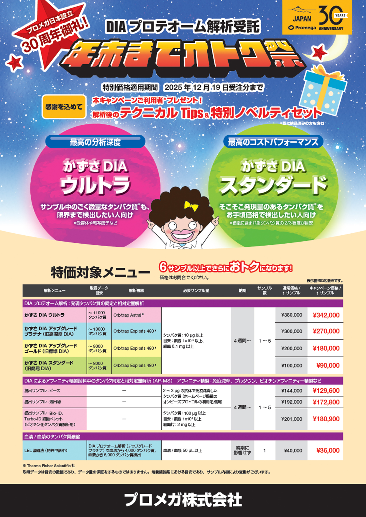 表示価格は税抜きです。 特価対象メニュー 解析メニュー取得データ 目安解析機器必要サンプル量納期サンプル 数 通常価格/ 1 サンプル キャンペーン価格/ 1 サンプル DIA プロテオーム解析:発現タンパク質の同定と相対定量解析 かずさDIA ウルトラ~ 11000 タンパク質Orbitrap Astral ※ タンパク質:10 μg 以上 目安:細胞 1×10 5 以上、 組織 0.1 mg 以上 4 週間~ 1 ~ 5 ¥380,000 ¥342,000 かずさDIA アップグレード プラチナ(旧高深度DIA) ~ 10000 タンパク質Orbitrap Exploris 480 ※ ¥300,000 ¥270,000 かずさDIA アップグレード ゴールド(旧標準DIA) ~ 9000 タンパク質Orbitrap Exploris 480 ※ ¥200,000 ¥180,000 かずさDIA スタンダード (旧簡易DIA) ~ 8000 タンパク質Orbitrap Exploris 480 ※ ¥100,000 ¥90,000 DIA によるアフィニティ精製試料中のタンパク同定と相対定量解析(AP-MS) アフィニティ精製:免疫沈降、プルダウン、ビオチンアフィニティー精製など 提出サンプル:ビーズー2 ~ 3 μg の抗体で免疫沈降した タンパク質(ホームページ掲載の オンビーズプロトコルの利用を推奨) 4 週間~ 1 ~ 5 ¥144,000 ¥129,600 提出サンプル:溶出物ー¥192,000 ¥172,800 提出サンプル:BIo-ID、 Turbo-ID 細胞ペレット (ビオチン化タンパク質解析用) ー タンパク質:100 μg 以上 目安:細胞 1×106 以上 組織片:2 mg 以上 ¥201,000 ¥180,900 血清/ 血漿のタンパク質濃縮 LEL 濃縮法(特許申請中) DIA プロテオーム解析(アップグレード プラチナ)で血清から4,000 タンパク質、 血漿から6,000 タンパク質検出 血清/ 血漿 50 μL 以上納期に 影響せず1 ¥40,000 ¥36,000 ※ Thermo Fisher Scienti c 社 取得データは目安の数値であり、データ量の保証をするものではありません。培養細胞系における目安であり、サンプル内容により変動がございます。 6サンプル以上でさらにおトクになります! 価格はお問合せください。 プロメガ日本設立 3030 周年御礼! DIAプロテオーム解析受託 特別価格適用期間 2025年 12月 19日受注分まで かずさDIA ウルトラ かずさDIA スタンダード サンプル中のごく微量なタンパク質*も、 限界まで検出したい人向け *受容体や転写因子など そこそこ発現量のあるタンパク質*を お手頃価格で検出したい人向け *細胞に含まれるタンパク質の2/3 程度が目安 最高の分析深度 最高のコストパフォーマンス *既に納品済みの方も含む 本キャンペーンご利用者*プレゼント! 解析後のテクニカル Tips & 特別ノベルティセット 感謝を込めて プロメガ株式会社 かずさDIA ウルトラ アップグレード プラチナ アップグレード ゴールド かずさDIA スタンダード 9000タンパク質 10000タンパク質 キナーゼ:532 / 転写因子:1539 受容体:357 / イオンチャネル:64 11068タンパク質 キナーゼ:562 / 転写因子:1777 受容体:422 /イオンチャネル:85 キナーゼ:488 / 転写因子:1330 受容体:303 / イオンチャネル:55 キナーゼ:442 / 転写因子:1139 受容体:249 / イオンチャネル:38 8000タンパク質 当サービスのかずさDIA ウルトラで検出されたタンパク質の ダイナミックレンジ(HEK293 細胞を用いた場合) 分析深度 コスト パフォーマンス まだまだ感度向上中! 研究目的に 合わせて選べる分析深度 定量性 DIA法により類似ペプチドを 再現性良く、感度よく検出 再現性 同一サンプル間(連続測定)の 相関係数は0.99 以上。 分析用のDuplicate を省略可能。 高品質データがスペシャル価格 DIAプロテオーム解析 従来の解析で検出できなかった微量なタンパク質の発現・相対定量解析が可能 ここが すごい! 今だけ! セクレトーム解析 疾患プロテオミクス バイオマーカー探索やってます! 血漿由来のエクソソームに含まれる タンパク質を同定したいです。 疾患モデル動物から 臓器の部位別に サンプルを採取し、 それに含まれるタンパク質の 比較定量解析をして 違いを明らかにしたいです。 分泌タンパク質は 基本的に低濃度でサンプル間の バラつきも大きいため、 高感度・定量性に優れ、 非ターゲット法である DIA プロテオーム解析は 理想的です! 組織中の部位間の差・ 発現量差が小さい場合があり、 高精度なかずさの DIA プロテオーム解析がおすすめです。 マルチサンプル比較にも強く、 非モデル生物でも解析可能です。 病期別解析における展開も期待できます。 微量タンパク質だけど 検出できるかな? かずさDIA ウルトラ ~ゴールド 選択メニュー 抽出したエクソソームの ペレット 送付サンプル かずさDIA ウルトラ ~スタンダード 選択メニュー 凍結組織、血漿・血清 (血漿・血清は別途オプション の前処理が必要となります) 送付サンプル 例えば こんな研究に* *選択メニュー、送付サンプルは一例です。 詳細・お問合せ・お見積り www.promega.co.jp/proteome_ jutaku/ その他、 イ ン タ ラ ク ト ー ム 解 析 も人気です。プルダウン後のビーズを溶出せずそのままサンプルとして提出できます。 テクニカルサービス ● Tel. 03-3669-7980 ● E-Mail : prometec@jp.promega.com PK2510-03B 販売店 日本語 Web site:www.promega.co.jp プロメガ株式会社 本 社 〒103-0001 東京都中央区日本橋小伝馬町1-5 PMO日本橋江戸通 Tel. 03-3669-7981 大阪事務所 〒541-0051 大阪市中央区備後町4-