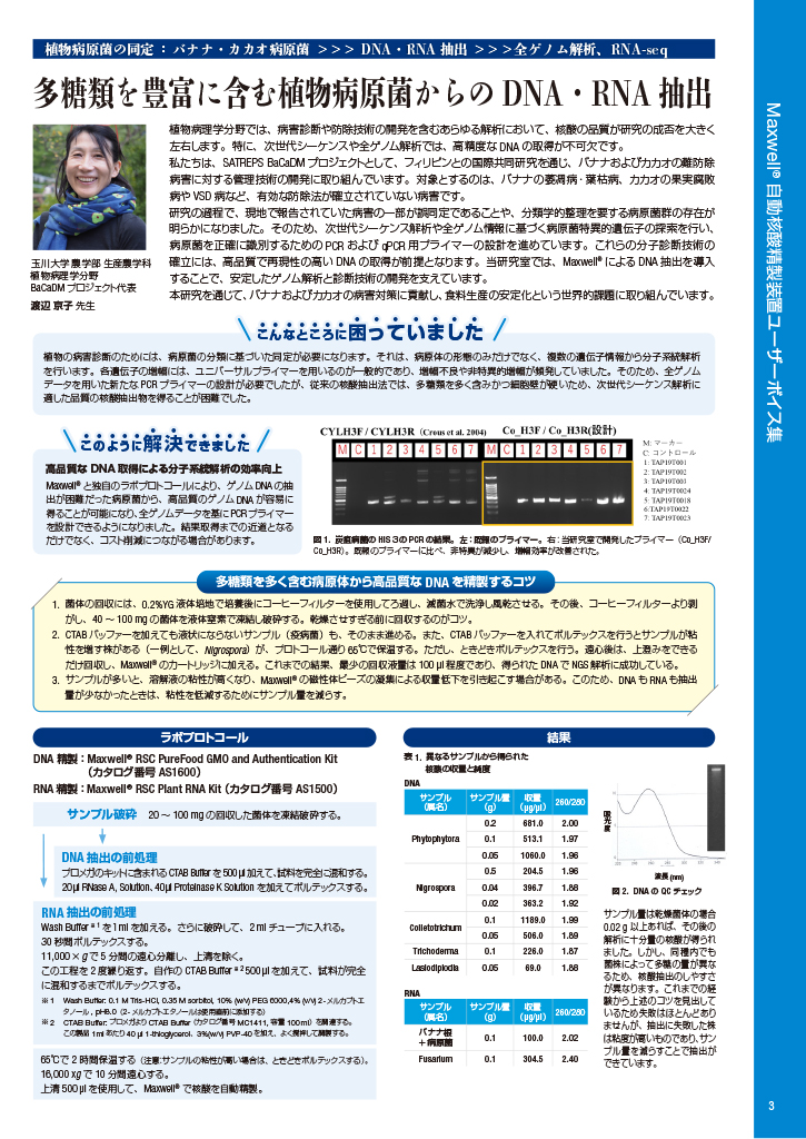 植物病原菌の同定 : バナナ・カカオ病原菌 >>> DNA・RNA 抽出 >>>全ゲノム解析、RNA-seq 多糖類を豊富に含む植物病原菌からのDNA・RNA 抽出 植物の病害診断のためには、病原菌の分類に基づいた同定が必要になります。それは、病原体の形態のみだけでなく、複数の遺伝子情報から分子系統解析を行います。各遺伝子の増幅には、ユニバーサルプライマーを用いるのが一般的であり、増幅不良や非特異的増幅が頻発していました。そのため、全ゲノムデータを用いた新たなPCR プライマーの設計が必要でしたが、従来の核酸抽出法では、多糖類を多く含みかつ細胞壁が硬いため、次世代シーケンス解析に適した品質の核酸抽出物を得ることが困難でした。 多糖類を多く含む病原体から高品質なDNA を精製するコツ 表1. 異なるサンプルから得られた 核酸の収量と純度 DNA RNA こんなところに 3 3 3 3 3 3 3 困っていました 3 3 3 3 3 3 3333 高品質なDNA 取得による分子系統解析の効率向上 Maxwell® と独自のラボプロトコールにより、ゲノムDNA の抽 出が困難だった病原菌から、高品質のゲノムDNA が容易に 得ることが可能になり、全ゲノムデータを基にPCR プライマー を設計できるようになりました。結果取得までの近道となる だけでなく、コスト削減につながる場合があります。 このように 3 3 3 3 3 解決 3 3 できました 3 3 3 3 3333 1. 菌体の回収には、0.2%YG 液体培地で培養後にコーヒーフィルターを使用してろ過し、滅菌水で洗浄し風乾させる。その後、コーヒーフィルターより剥 がし、40 ~ 100 mg の菌体を液体窒素で凍結し破砕する。乾燥させすぎる前に回収するのがコツ。 2. CTAB バッファーを加えても液状にならないサンプル(疫病菌)も、そのまま進める。また、CTAB バッファーを入れてボルテックスを行うとサンプルが粘 性を増す株がある(一例として、Nigrospora)が、プロトコール通り65℃で保温する。ただし、ときどきボルテックスを行う。遠心後は、上澄みをできる だけ回収し、Maxwell® のカートリッジに加える。これまでの結果、最少の回収液量は100 μl 程度であり、得られたDNA でNGS 解析に成功している。 3. サンプルが多いと、溶解液の粘性が高くなり、Maxwell® の磁性体ビーズの凝集による収量低下を引き起こす場合がある。このため、DNA もRNA も抽出 量が少なかったときは、粘性を低減するためにサンプル量を減らす。 ラボプロトコール結果 サンプル破砕 20 ~ 100 mg の回収した菌体を凍結破砕する。 65℃で2 時間保温する(注意:サンプルの粘性が高い場合は、ときどきボルテックスする)。 16,000 xg で10 分間遠心する。 上清500 μl を使用して、Maxwell® で核酸を自動精製。 DNA 抽出の前処理 プロメガのキットに含まれるCTAB Buffer を500 μl 加えて、試料を完全に混和する。 20 μl RNase A, Solution、40μl Proteinase K Solution を加えてボルテックスする。 DNA 精製: Maxwell® RSC PureFood GMO and Authentication Kit (カタログ番号 AS1600) RNA 精製:Maxwell® RSC Plant RNA Kit (カタログ番号 AS1500) 植物病理学分野では、病害診断や防除技術の開発を含むあらゆる解析において、核酸の品質が研究の成否を大きく 左右します。特に、次世代シーケンスや全ゲノム解析では、高精度なDNA の取得が不可欠です。 私たちは、SATREPS BaCaDM プロジェクトとして、フィリピンとの国際共同研究を通じ、バナナおよびカカオの難防除 病害に対する管理技術の開発に取り組んでいます。対象とするのは、バナナの萎凋病・葉枯病、カカオの果実腐敗 病やVSD 病など、有効な防除法が確立されていない病害です。 研究の過程で、現地で報告されていた病害の一部が誤同定であることや、分類学的整理を要する病原菌群の存在が 明らかになりました。そのため、次世代シーケンス解析や全ゲノム情報に基づく病原菌特異的遺伝子の探索を行い、 病原菌を正確に識別するためのPCR およびqPCR 用プライマーの設計を進めています。これらの分子診断技術の 確立には、高品質で再現性の高いDNA の取得が前提となります。当研究室では、Maxwell® によるDNA 抽出を導入 することで、安定したゲノム解析と診断技術の開発を支えています。 本研究を通じて、バナナおよびカカオの病害対策に貢献し、食料生産の安定化という世界的課題に取り組んでいます。 多糖類を豊富に含む植物病原菌からのDNA・RNA 抽出 玉川大学 農学部 生産農学科 植物病理学分野 BaCaDM プロジェクト代表 渡辺 京子 先生 植物病原菌の同定 : バナナ・カカオ病原菌 >>> DNA・RNA 抽出 >>>全ゲノム解析、RNA-seq 図1. 炭疽病菌のHIS 3のPCR の結果。左:既報のプライマー。右:当研究室で開発したプライマー(Co_H3F/ Co_H3R)。既報のプライマーに比べ、非特異が減少し、増幅効率が改善された。 RNA 抽出の前処理 Wash Buffer ※ 1 を1ml を加える。さらに破砕して、2 ml チューブに入れる。 30 秒間ボルテックスする。 11,000 ×g で5 分間の遠心分離し、上清を除く。 この工程を2 度繰り返す。自作のCTAB Buffer ※ 2 500 μl を加えて、試料が完全 に混和するまでボルテックスする。 ※ 1 Wash Buffer: 