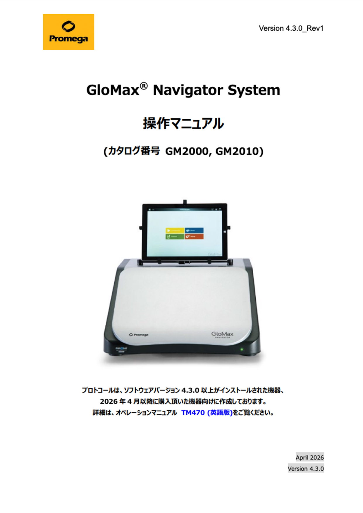 Version 4.3.0_Rev1 GloMax® Navigator System プロトコールは、ソフトウェアバージョン4.3.0以上がインストールされた機器、 2026年4月以降に購入頂いた機器向けに作成しております。 詳細は、オペレーションマニュアル TM470 (英語版)をご覧ください。 April 2026 Version 4.3.0 Version 4.3.0_Rev1 目次 GloMax® Navigator Systemの準備 ································································ 1 GloMax® Navigator Systemの構成品 ·························································· 1 GloMax® Navigator Systemの各部位の名称 ·················································· 2 GloMax® Navigator Systemの設置 ····························································· 2 GloMax® Navigator Systemの使い方 ······························································ 3 GloMax® Navigator Systemの使用準備 ······················································· 3 ホーム画面の説明 ······················································································· 4 PROTOCOLSモードでの測定 ·············································································· 5 プロトコールの選択と設定方法 ········································································· 5 サンプルプレートのセットと測定 ·········································································· 6 サンプルプレートの取り出し ·············································································· 6 測定結果の表示 ························································································ 7 データの変換 ・ 持ち出し ··············································································· 7 簡易測定モードでのクイック測定 ············································································ 9 終了方法 ································································································ 10 カスタムプロトコール ··························································································· 11 カスタムプロトコールの作成 ·············································································· 11 プロトコールアイコンの説明 ·············································································· 12 Time Courseプロトコールの作成……………………………………………‥‥……………15 Plate Mapのインポート ····················································································· 16 ファイルからのPlate Mapインポート ··································································· 16 Portal ソフトウエアからのPlate Mapのインポート ··················································· 21 Dual Injectors and Pumpの操作方法(GM2010のみ) ····································· 25 操作の概要 ······························································································ 25 試薬の充填 ······························································································ 25 インジェクターの洗浄 ····················································································· 27 測定結果の解析機能 ························································································· 28 解析の流れ ······························································································ 28 TEMPLATEの作成 ···················································································· 29 TEMPLATEの呼び出しと解析 ········································································ 33 解析結果の保存 ····················