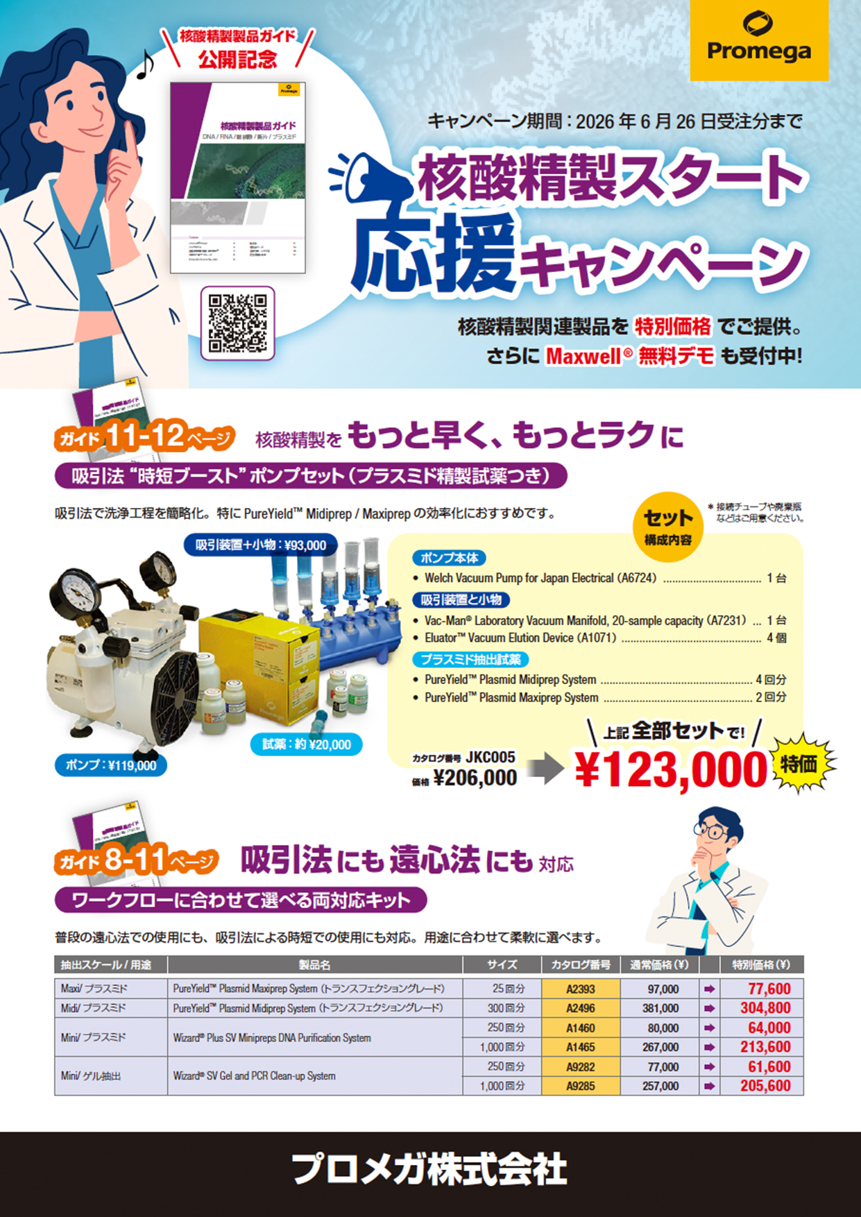 核酸精製スタート応援キャンペーン 核酸精製製品ガイド公開記念 キャンペーン期間:2026年6月26日受注分まで 核酸精製関連製品を特別価格でご提供。 さらに Maxwell® 無料デモも受付中! イントロダクション 2 インデックス 3 自動核酸精製装置Maxwell® 4 ReliaPrep™ シリーズ 6 シリカメンブレンカラムキット 8 吸引法 11 磁性体ビーズ 13 液相分離・レジン法 16 逆引き製品検索 17 Contents 核酸精製製品ガイド DNA / RNA /総核酸/断片/プラスミド イントロダクション 2 インデックス 3 自動核酸精製装置Maxwell® 4 ReliaPrep™ シリーズ 6 シリカメンブレンカラムキット 8 吸引法 11 磁性体ビーズ 13 液相分離・レジン法 16 逆引き製品検索 17 Contents 核酸精製製品ガイド DNA / RNA /総核酸/断片/プラスミド ワークフローに合わせて選べる両対応キット 普段の遠心法での使用にも、吸引法による時短での使用にも対応。用途に合わせて柔軟に選べます。 抽出スケール/ 用途製品名サイズカタログ番号通常価格(¥) 特別価格(¥) Maxi/ プラスミドPureYield™ Plasmid Maxiprep System(トランスフェクショングレード) 25 回分A2393 97,000 77,600 Midi/ プラスミドPureYield™ Plasmid Midiprep System(トランスフェクショングレード) 300 回分A2496 381,000 304,800 Mini/ プラスミドWizard® Plus SV Minipreps DNA Puri cation System 250 回分A1460 80,000 64,000 1,000 回分A1465 267,000 213,600 Mini/ ゲル抽出Wizard® SV Gel and PCR Clean-up System 250 回分A9282 77,000 61,600 1,000 回分A9285 257,000 205,600 吸引法“ 時短ブースト”ポンプセット(プラスミド精製試薬つき) 吸引法で洗浄工程を簡略化。特にPureYield™ Midiprep / Maxiprep の効率化におすすめです。 ガイド 8-11ページ ガイド 11-12ページ 吸引法にも遠心法にも 対応 核酸精製をもっと早く、もっとラクに ポンプ本体 • Welch Vacuum Pump for Japan Electrical(A6724) …………………………… 1 台 吸引装置と小物 • Vac-Man® Laboratory Vacuum Manifold, 20-sample capacity(A7231) … 1 台 • Eluator™ Vacuum Elution Device(A1071) ……………………………………….. 4 個 プラスミド抽出試薬 • PureYield™ Plasmid Midiprep System …………………………………………… 4 回分 • PureYield™ Plasmid Maxiprep System ………………………………………….. 2 回分 カタログ番号 JKC005 価格 ¥206,000 ポンプ:¥119,000 ¥123,000 特価 試薬:約¥20,000 吸引装置+小物:¥93,000 上記 全部セット で! セット 構成内容 * 接続チューブや廃棄瓶 などはご用意ください。 イントロダクション 2 インデックス 3 自動核酸精製装置Maxwell® 4 ReliaPrep™ シリーズ 6 シリカメンブレンカラムキット 8 吸引法 11 磁性体ビーズ 13 液相分離・レジン法 16 逆引き製品検索 17 Contents 核酸精製製品ガイド DNA / RNA / 総核酸/ 断片/ プラスミド プロメガ株式会社 プロメガクラブは、ご登録いただきますと様々な特典が受けられる、 プロメガ製品ユーザーのための会員サービスです(無料)。 核酸精製製品をより便利に、より安心してご活用いただける特典をご用意しています。 ミニカラム単品購入可能 Wizard® SV キットで使えるミニカラ ムを単品で購入できます。 試薬を無駄なく使用できます。 オンサイト/ オンラインセミナー 核酸精製の基礎から効率化のポイントまで学べるセミナーを 実施します。 お申込み https://promegajp.formstack.com/forms/maxwell_demo ※お申込み後、担当者よりデモ実施日時などの詳細をご連絡いたします。 適合キットなど詳細 www.promega.co.jp/special/club/limited/ 会員特典 1 会員特典 2 おすすめの タイトル 吸引システムを用いた核酸抽出の効率化 RNA 抽出講座 核酸精製コンサルティング セミナー抄録など詳細 www.promega.co.jp/promega_resources/ academy/ プロメガクラブなら、購入後も核酸精製をしっかりサポート プロメガクラブ検 索 プロメガクラブ詳細は デモで確認できること イントロダクション 2 インデックス 3 自動核酸精製装置Maxwell® 4 ReliaPrep™ シリーズ 6 シリカメンブレンカラムキット 8 吸引法 11 磁性体ビーズ 13 液相分離・レジン法 16 逆引き製品検索 17 Contents 核酸精製製品ガイド DNA / RNA / 総核酸/断片/プラスミド お使いのサンプルで試せるMaxwell® 無料デモ Maxwell® は、結果のバラつき低減、研究時間の創出、 ヒューマンエラー抑制に貢献する自動核酸精製装置です。 プレパックカートリッジ採用によりセットアップも簡便。 まずは実際のサンプルで、使いやすさと安定性をご体感ください。 ガイド 4-5ページまずは1 回、Maxwell®の手離れ をご体感ください サンプルに 合った 精製条件 推奨キットの ご提案× × Maxwell® RSC 現行法との 比較 ゲノム編集チェックも 細胞 &培地 400 μL 入れるだけ テクニカルサービス ● Tel. 03-3669-7980 ● E-Mail : prometec@jp.promega.com PK2604-04B 販売店 日本語 Web site:www.promega.co.jp プロメガ株式会社 本 社 〒103-0001 東京都中央区日本橋小伝馬町1-5 PMO日本橋江戸通 Tel. 03-3669-7981 大阪事務所 〒541-0051 大阪市中央区備後町4-1-3 御堂筋三井ビルディング Tel. 06-6202-4581 ※製品の仕様、価格については2026 年4 月現在のものであり予告なしに変更することがあります。