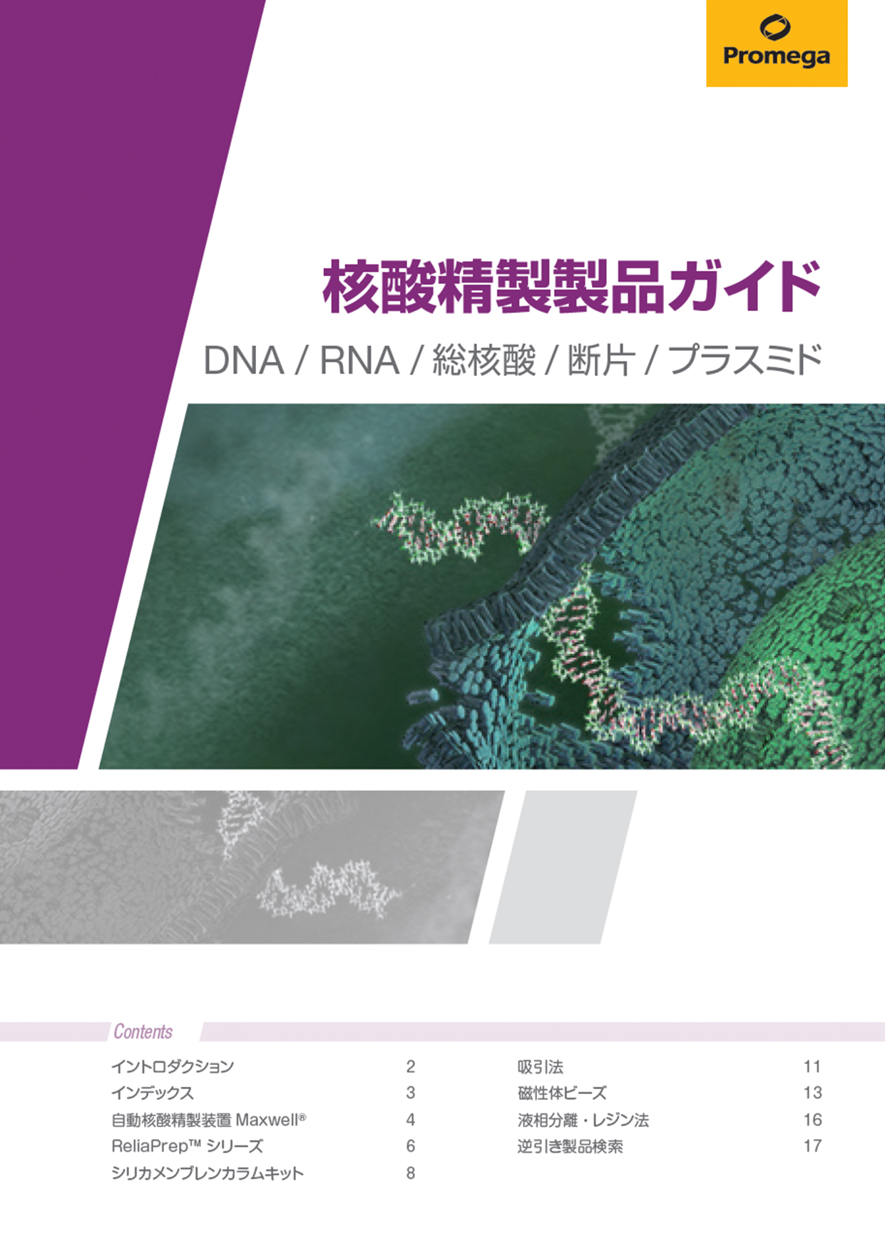 核酸精製製品ガイド DNA / RNA / 総核酸/ 断片/ プラスミド 無口な細胞の中にある、無数の情報を紐解く 生命現象を理解する第一歩は、細胞が持つDNA / RNA などの情報を取り出し、解析できる形に整えることです。目的とする核酸は、 タンパク質や他の細胞成分、不要な夾雑物が除去された状態で精製されている必要があります。精製法の最適化は、扱いが難し いサンプルや要求の厳しい下流アプリケーションにおいて成功の鍵となります。 イントロダクション Contents インデックス 自動核酸精製装置Maxwell® ReliaPrep™ シリーズ シリカメンブレンカラムキット 吸引法 磁性体ビーズ 液相分離・レジン法 逆引き製品検索 核酸精製製品ガイド DNA / RNA / 総核酸/ 断片/ プラスミド 無口な細胞の中にある、無数の情報を紐解く 生命現象を理解する第一歩は、細胞が持つDNA / RNA などの情報を取り出し、解析できる形に整えることです。目的とする核酸は、 タンパク質や他の細胞成分、不要な夾雑物が除去された状態で精製されている必要があります。精製法の最適化は、扱いが難し いサンプルや要求の厳しい下流アプリケーションにおいて成功の鍵となります。 プロメガは単回精製の用手法ソリューションから、自動化精製装置Maxwell®、さらに自動分注機に対応したプレートベースのシステ ムまで、幅広いサンプル処理スループットのニーズをカバーする「取り出すチカラ」を提供します。サンプル種や目的に応じたワー クフロー構築を支援し、安定した核酸回収と再現性の高いデータ取得につなげます。本ガイドでは、多様なサンプル種からゲノム DNA、プラスミドDNA、RNA、または総核酸を高収量かつ高品質で得られる核酸精製製品をご紹介します。さらに、希薄な溶液、 ゲル切片、PCR 産物からDNA またはRNA をクリーンアップおよび濃縮するための製品も併せて掲載しています。 レポーターアッセイ NanoLuc® 発光レポーターを利用して 細胞内のシグナル経路を測定 無口な細胞 (見えない情報) わずかな変化 極小分子 Pharma Clinical Applied OEM Maxwell® 核酸自動精製装置 • 磁性体ビーズで効率的に核酸をGet! Quantus™ 小型蛍光測定装置 • 吸光法より正確に核酸測定 Vac-Man® 吸引マニホールド • 精製カラムを同時処理 Spectrum シーケンサー • 研究者にやさしい簡単メインテナンス& 低消耗品コスト Maxprep® リキッドハンドリング システム • ピペッティング地獄の 濃度平準化が自動に! GloMax® プレートリーダー • プロメガアッセイ法に最適化 MyGlo® 小型発光専用測定機器 • クラウド連携、アプリで操作 GloMax® Galaxy 細胞発光イメージャー • NanoLuc® テクノロジーを 可視化 Automated Purification Automated Liquid Handling Screening Tailored R&D Service Cell as Reagent フラグメント解析 PowerPlex® / MSI / ProDye® 診断・検査にも応用されるプロメガの STR / MSI / シーケンシング技術 増幅& 修飾酵素 GoTaq® / GoScript 基礎研究から応用分野に利用される 信頼のブランド Maxwell® RSC 核酸精製キット Maxwell® Kit 難しいサンプルからでも高純度・高収量 細胞生存アッセイ CellTiter-Glo® 他 発光法により細胞量の 指標であるATP を高感度に測定 細胞代謝物アッセイ Glucose-Glo® 他 最も簡便な代謝マーカー測定試薬 標的相互作用検出 NanoBRET® / NanoBiT® 細胞内で起こる真の相互作用を検出! イメージング HaloTag® / NanoLuc® 発光および蛍光でバイオロジーを 詳細に観察! トランス フェクション FuGENE® 細胞にやさしい導入試薬 プロテオーム解析 DIA / トリプシン ついに10,000 種の タンパク質の観測を実現 スピンカラム 精製キット Wizard® / Reliaprep® 実績豊富なカラム式核酸精製キット 細胞を紐解く (情報の解読) Manual and semi-automatic Purification 標的タンパク質検出 HiBiT / Lumit ® 標的タンパク質を高感度に測定する 2 つのアプローチ取 り だ す チ カ ラ 見つけるチカラ Connect Clone CRISPR 2 導入コスト重視 や ロースループット なら カラム法 自動化プラットフォーム による ハイスループット なら 磁性体ビーズ 確実性 と 再現性 なら Maxwell®(自動精製) 6-10ページ 13-15ページ 4-5ページ このガイドの活用法と最適なテクノロジーの選び方 本ガイドは、多様なサンプルから高品質な核酸を安定して回収するための最適なソリューションを提案します。目的の製品をスムー ズに選定いただけるよう、以下の2 つの視点で構成されています。 皆様の研究目的や実験環境に応じた、効率的なワークフロー構築に本ガイドをご活用ください。 価格および構成品の単品購入について 製品を検討される際は、以下の情報もあわせてご活用ください。 製品の価格について 製品価格は改訂される場合があるため、常に最新の情報を掲載している下記ウェブサイトにてご確認ください。 プロメガ製品サイト www.promega.jp 構成品の単品購入について Wizard® SV シリーズなど、構成品の多くを個別に購入できる製品もあり、必要な試薬のみを補充して無駄なくお使い いただけます。各キット構成品の公開可能な組成情報や、単品販売の有無については