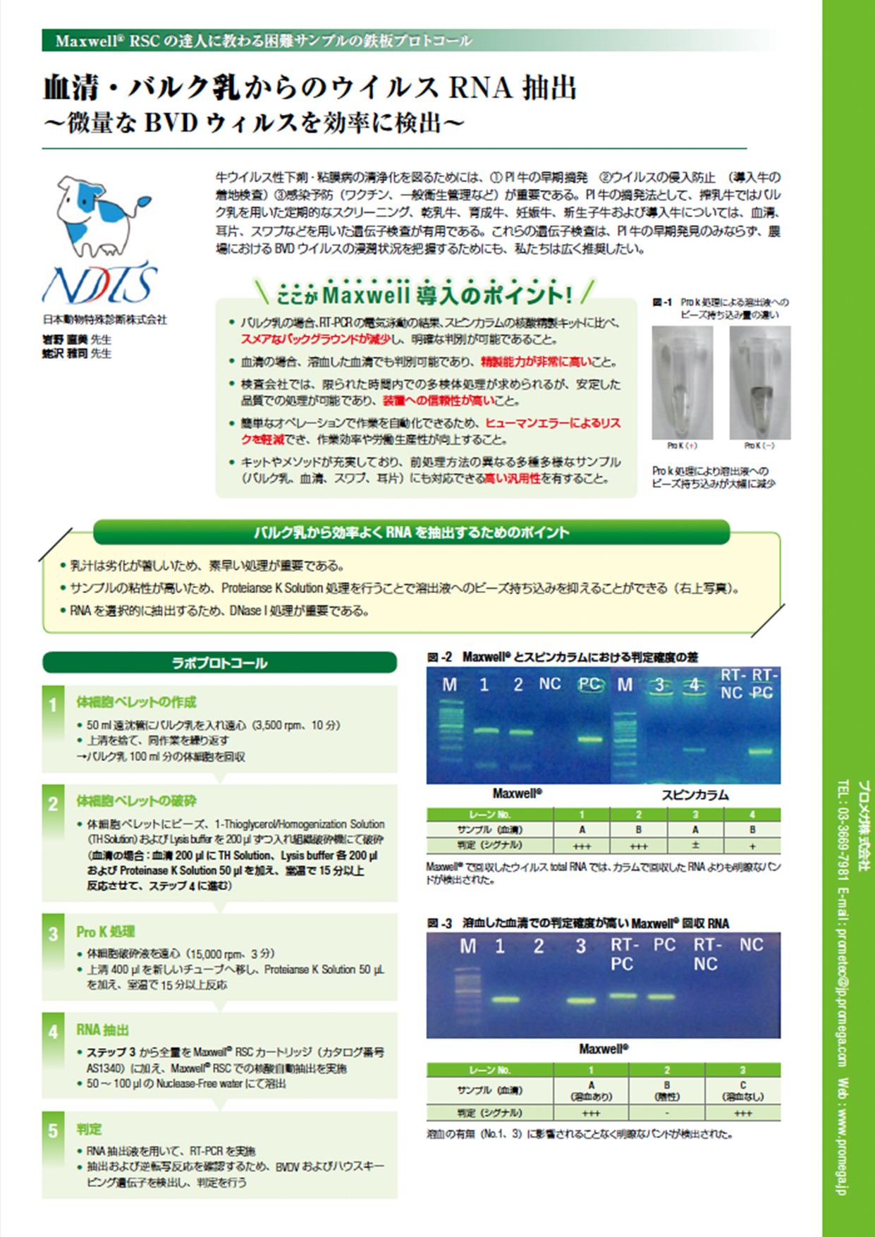 血清・バルク乳からのウイルスRNA抽出 ~微量なBVDウイルスを効率的に検出~ ここがMaxwell 導入のポイント! • バルク乳の場合、RT-PCRの電気泳動の結果、スピンカラムの核酸精製キットに比べ、スメアなバックグラウンドが減少し、明確な判別が可能であること。 • 血清の場合、溶血した血清でも判別可能であり、精製能力が非常に高いこと。 • 検査会社では、限られた時間内での多検体処理が求められるが、安定した品質での処理が可能であり、装置への信頼性が高いこと。 • 簡単なオペレーションで作業を自動化できるため、ヒューマンエラーによるリスクを軽減でき、作業効率や労働生産性が向上すること。 • キットやメソッドが充実しており、前処理方法の異なる多種多様なサンプル(バルク乳、血清、スワブ、耳片)にも対応できる高い汎用性を有すること。 牛ウイルス性下痢・粘膜病の清浄化を図るためには、① PI 牛の早期摘発 ②ウイルスの侵入防止 (導入牛の着地検査)③感染予防(ワクチン、一般衛生管理など)が重要である。PI 牛の摘発法として、搾乳牛ではバルク乳を用いた定期的なスクリーニング、乾乳牛、育成牛、妊娠牛、新生子牛および導入牛については、血清、耳片、スワブなどを用いた遺伝子検査が有用である。これらの遺伝子検査は、PI 牛の早期発見のみならず、農場におけるBVD ウイルスの浸潤状況を把握するためにも、私たちは広く推奨したい。 血清・バルク乳からのウイルスRNA 抽出 〜微量なBVD ウィルスを効率に検出〜 日本動物特殊診断株式会社 岩野 直美 先生 蛯沢 雅司 先生 Maxwell® RSC の達人に教わる困難サンプルの鉄板プロトコール Pro K( +) Pro K( -) 図-1  Pro k 処理による溶出液への ビーズ持ち込み量の違い Pro k 処理により溶出液への ビーズ持ち込みが大幅に減少 ラボプロトコール 体細胞ペレットの作成 • 50 ml 遠沈管にバルク乳を入れ遠心(3,500 rpm、10 分) • 上清を捨て、同作業を繰り返す →バルク乳100 ml 分の体細胞を回収 RNA 抽出 • ステップ 3 から全量をMaxwell® RSC カートリッジ(カタログ番号 AS1340)に加え、Maxwell® RSC での核酸自動抽出を実施 • 50 ~ 100 μl のNuclease-Free water にて溶出 判定 • RNA 抽出液を用いて、RT-PCR を実施 • 抽出および逆転写反応を確認するため、BVDV およびハウスキー ピング遺伝子を検出し、判定を行う Pro K 処理 • 体細胞破砕液を遠心(15,000 rpm、3 分) • 上清400 μl を新しいチューブへ移し、Proteianse K Solution 50 μL を加え、室温で15 分以上反応 2 体細胞ペレットの破砕 • 体細胞ペレットにビーズ、1-Thioglycerol/Homogenization Solution (TH Solution)およびLysis buffer を200 μl ずつ入れ組織破砕機にて破砕 (血清の場合:血清200 μl にTH Solution、Lysis buffer 各200 μl および Proteinase K Solution 50 μl を加え、室温で15 分以上 反応させて、ステップ4 に進む) • 乳汁は劣化が著しいため、素早い処理が重要である。 • サンプルの粘性が高いため、Proteianse K Solution 処理を行うことで溶出液へのビーズ持ち込みを抑えることができる(右上写真)。 • RNA を選択的に抽出するため、 DNase I 処理が重要である。 バルク乳から効率よくRNA を抽出するためのポイント 図-2  Maxwell® とスピンカラムにおける判定確度の差 レーン No. 1 2 3 4 サンプル(血清) A B A B 判定(シグナル) +++ +++ ± + Maxwell® で回収したウイルスtotal RNA では、カラムで回収したRNA よりも明瞭なバン ドが検出された。 Maxwell® スピンカラム 図-3  溶血した血清での判定確度が高いMaxwell® 回収 RNA レーン No. 1 2 3 サンプル(血清) A (溶血あり) B (陰性) C (溶血なし) 判定(シグナル) +++ – +++ 溶血の有無(No.1、3)に影響されることなく明瞭なバンドが検出された。 Maxwell® プロメガ株式会社 TEL:03-3669-7981 E-mail : prometec@jp.promega.com Web : www.promega.jp