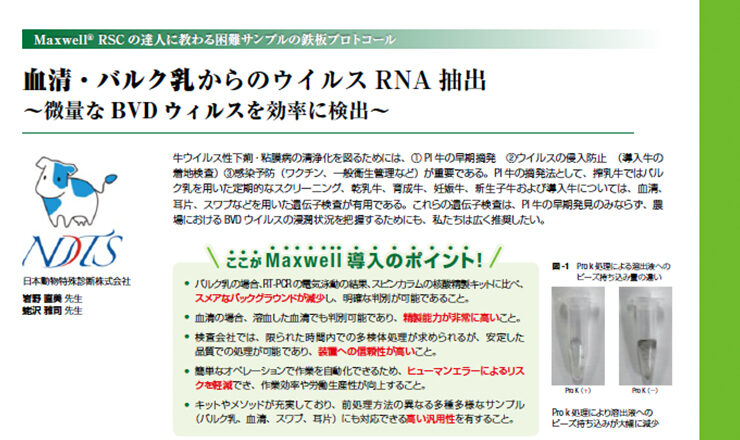 血清・バルク乳からのウイルスRNA抽出 ~微量なBVDウイルスを効率的に検出~ ここがMaxwell 導入のポイント! • バ...