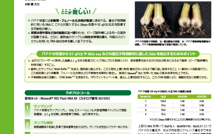 植物の発現解析:バナナ球茎>>> RNA 抽出>>> RT-qPCR, RNA-seq バナナ萎凋病菌への防御応答機構の解析に...