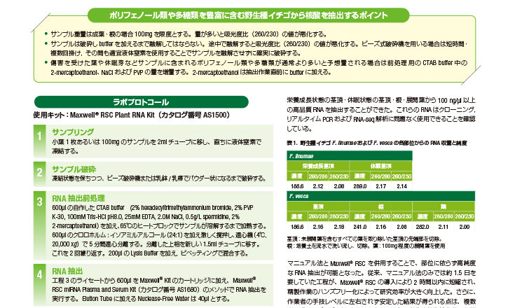 植物の発現解析:イチゴ葉 >>> RNA 抽出 >>> RT-qPCR, RNA-seq 野生種イチゴサンプルからのRNA 抽...